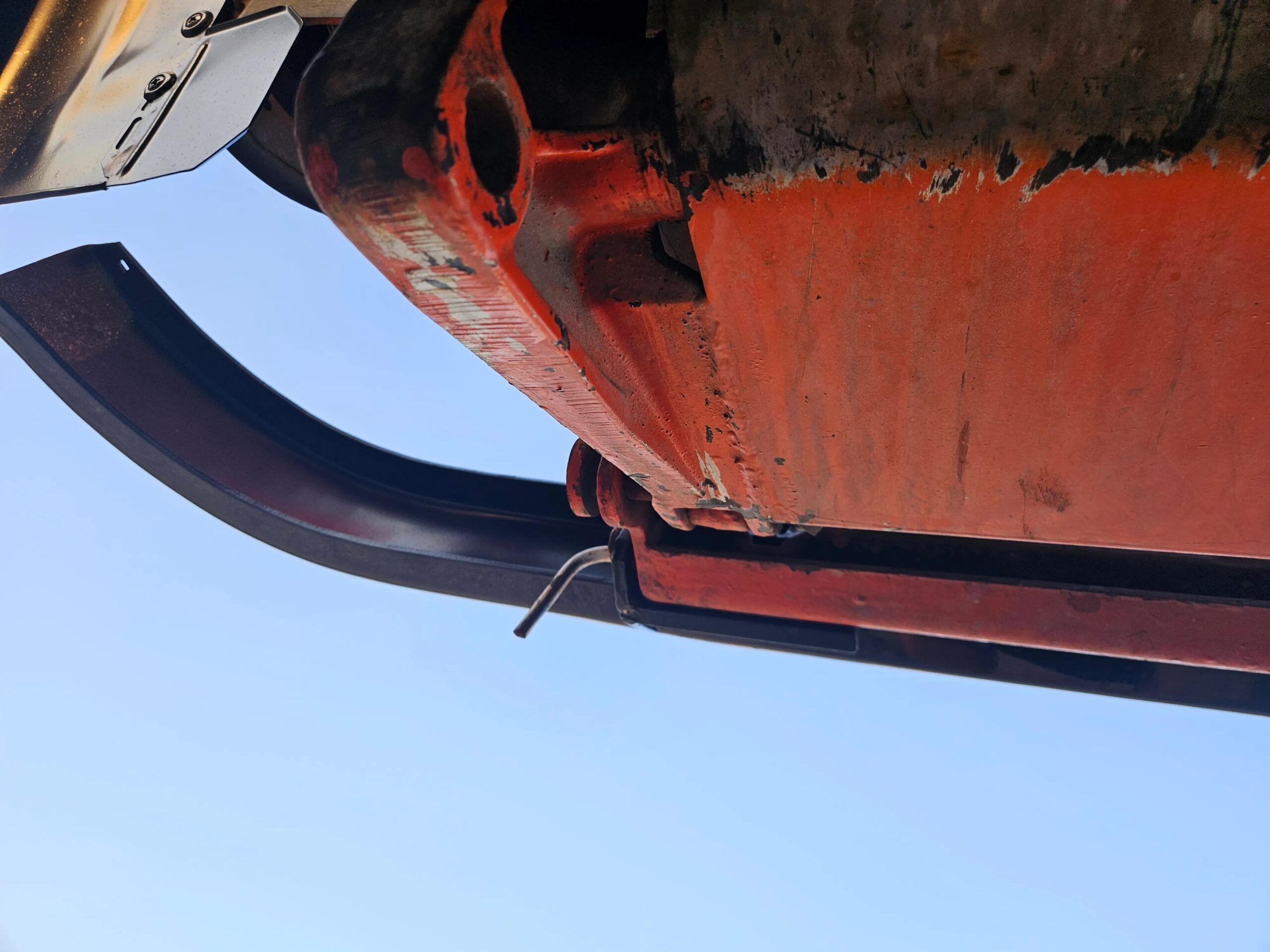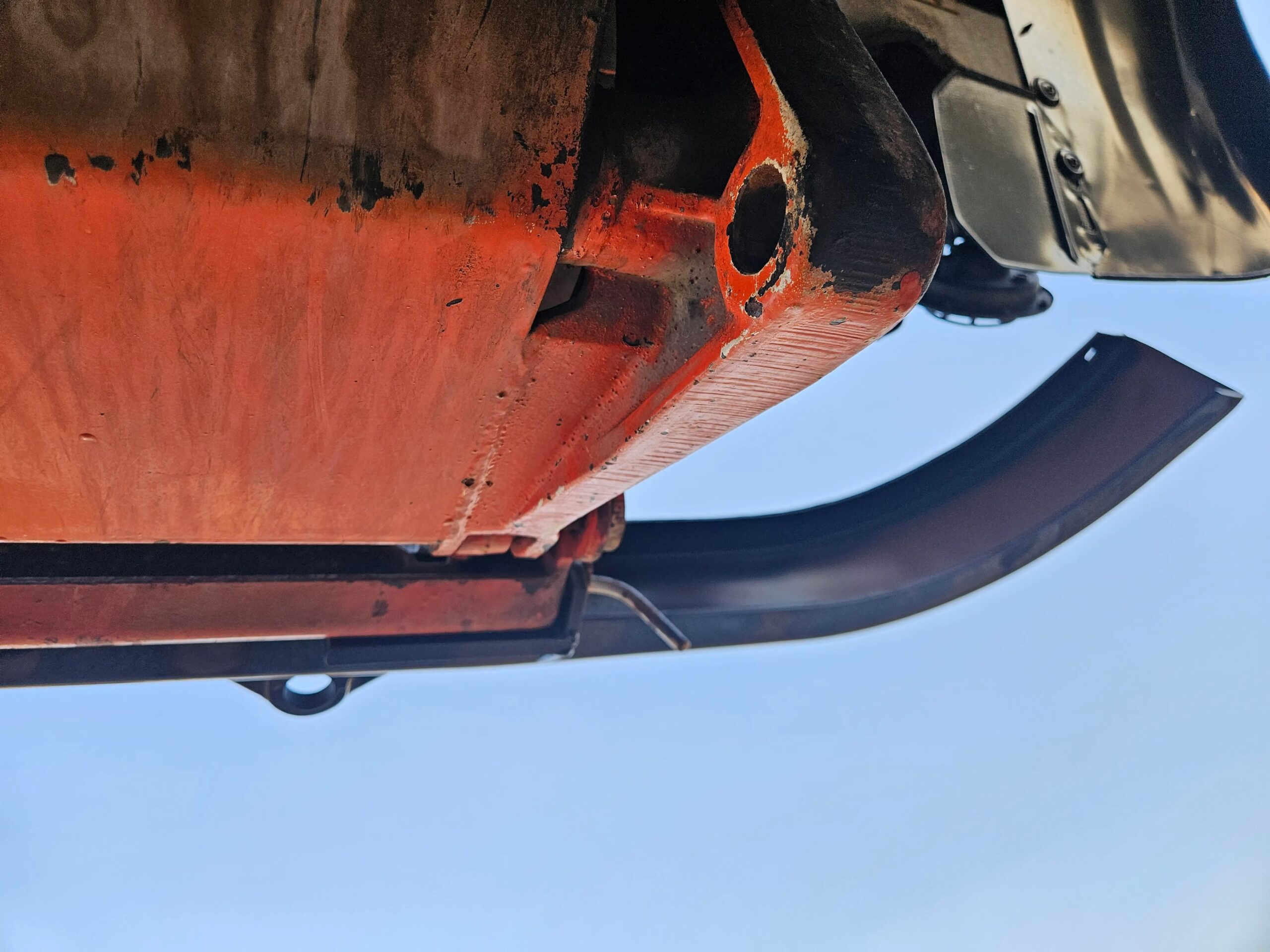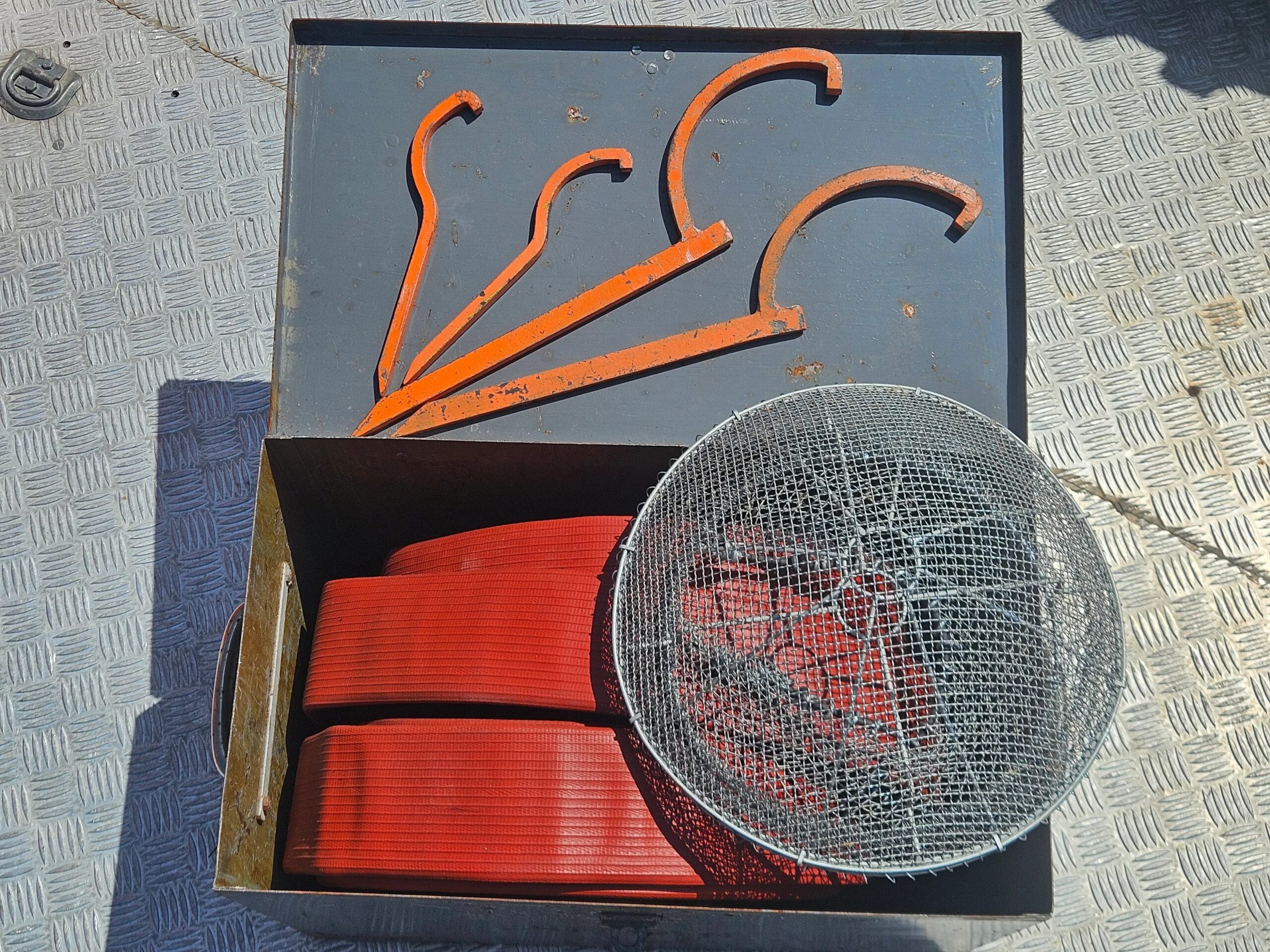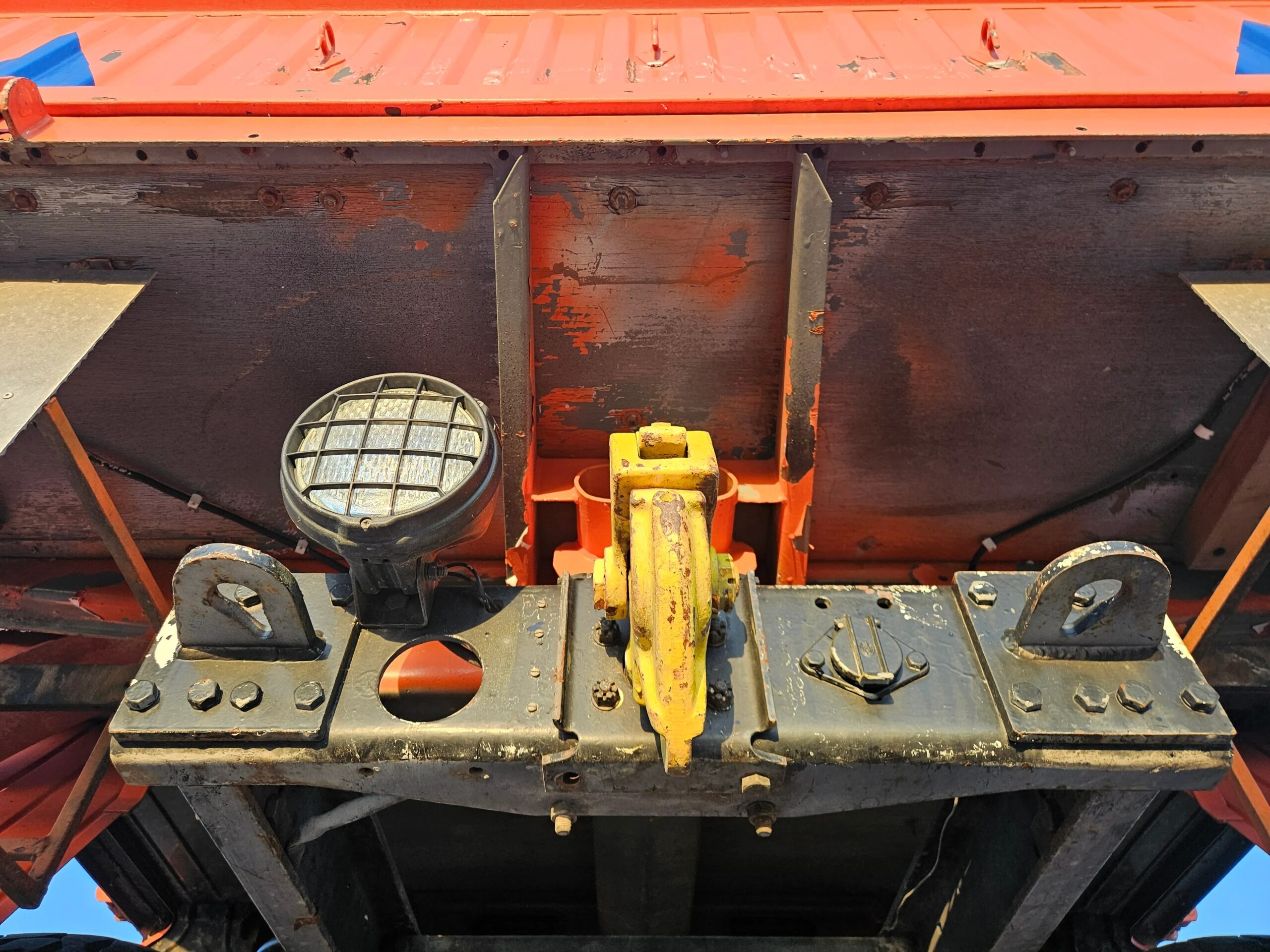 The bodywork is finished in orange with blue accents. Equipment includes a black front bumper and fenders, front and rear telescopic work lights, a rear pintle hitch, side steps, twin spotlights, and Hella auxiliary lamps. The bed features a textured metal floor along with folding side and rear panels. The truck is equipped with emergency lights and a siren, the latter of which has been disconnected. The hood bears the faded text “Sivilforsvaret,” which translates to “Civil Defense” in Norwegian. The front bumper and fenders were repainted