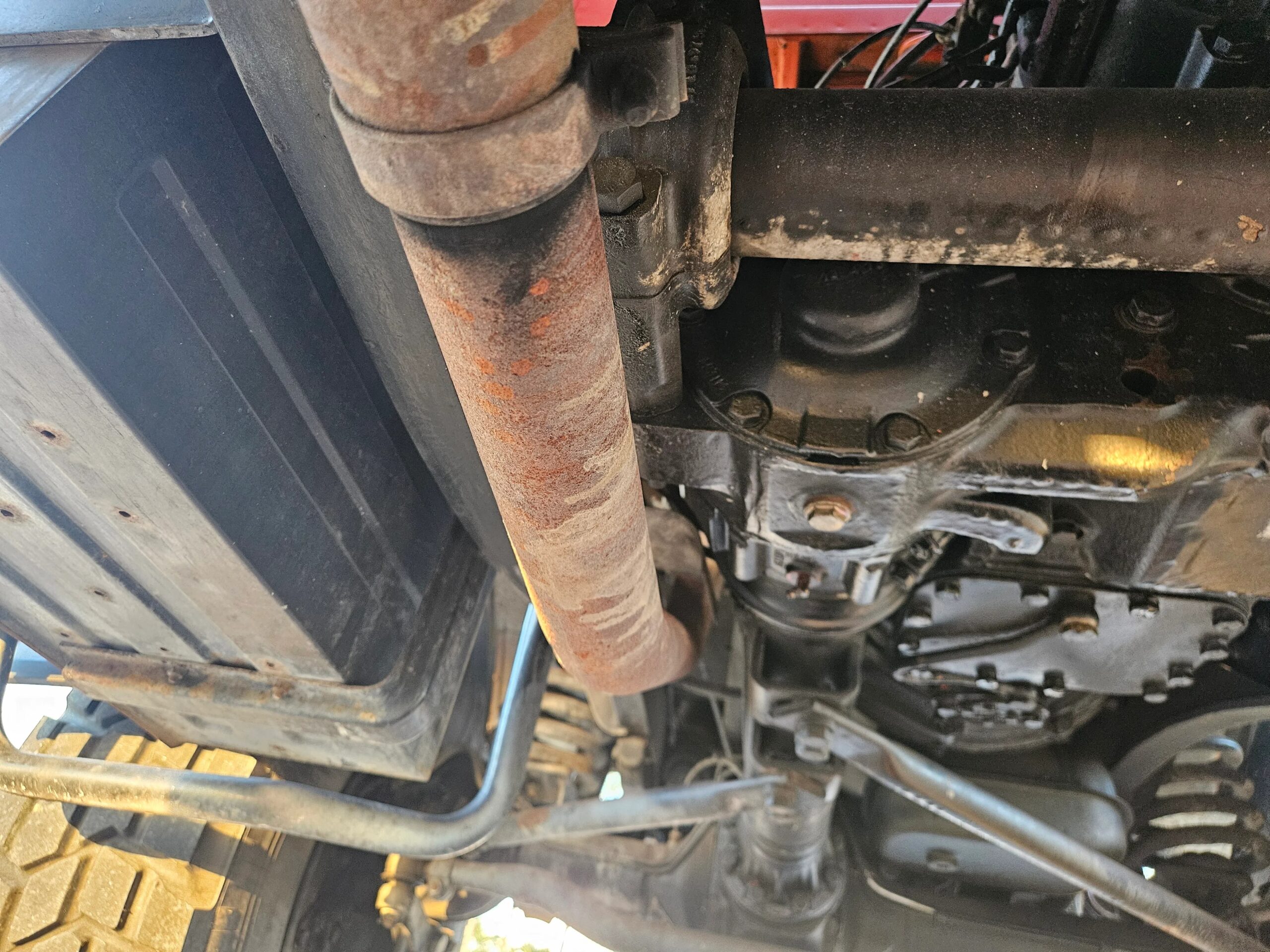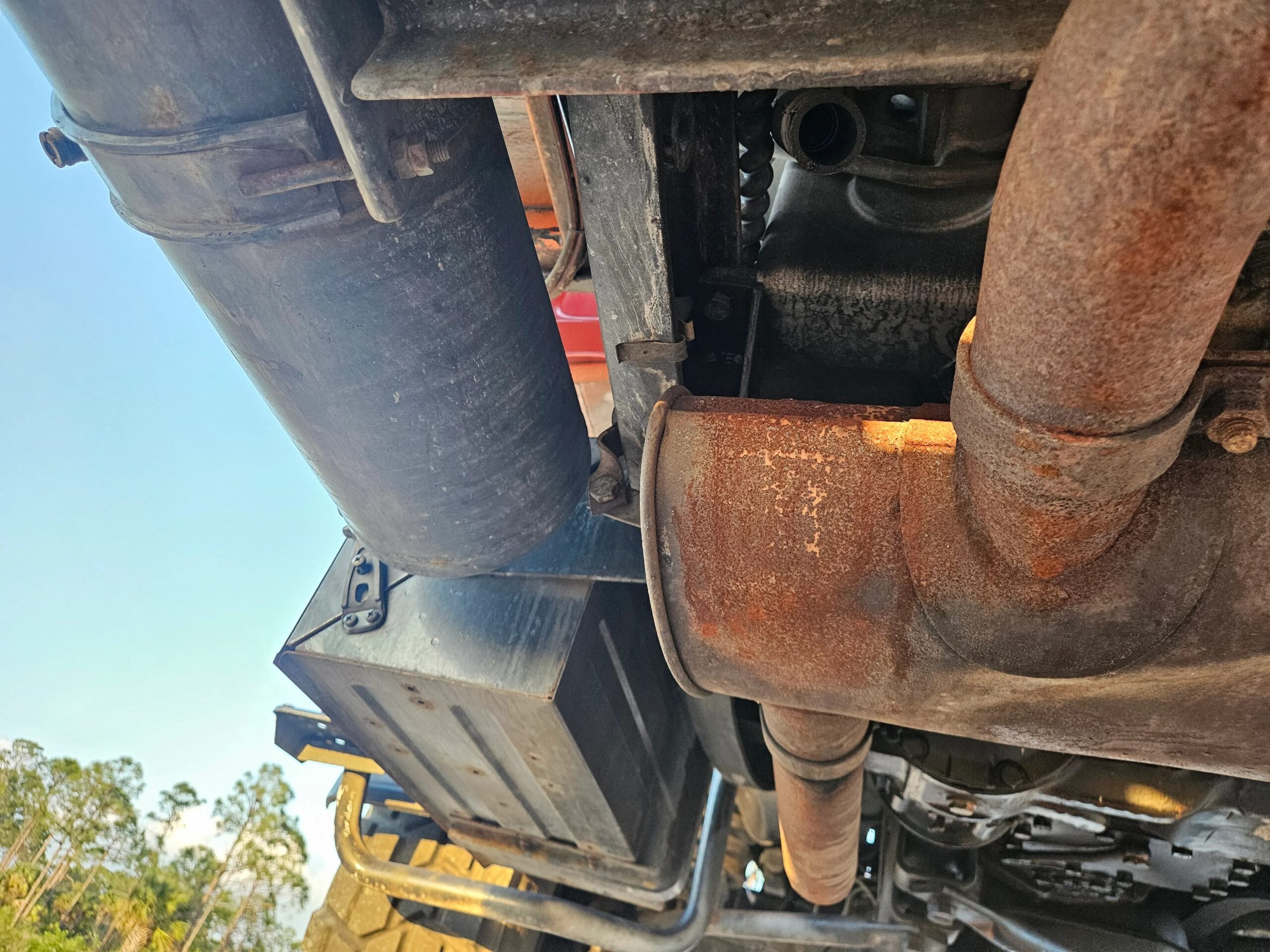 The truck is equipped with a cab-controlled power take-off (PTO) system that uses engine power to drive additional accessories, including a water pump mounted under the left side of the bed. The front bumper also has an access cutout for a PTO shaft. Controls and instrumentation for the water pump are mounted between the bed and the cab.