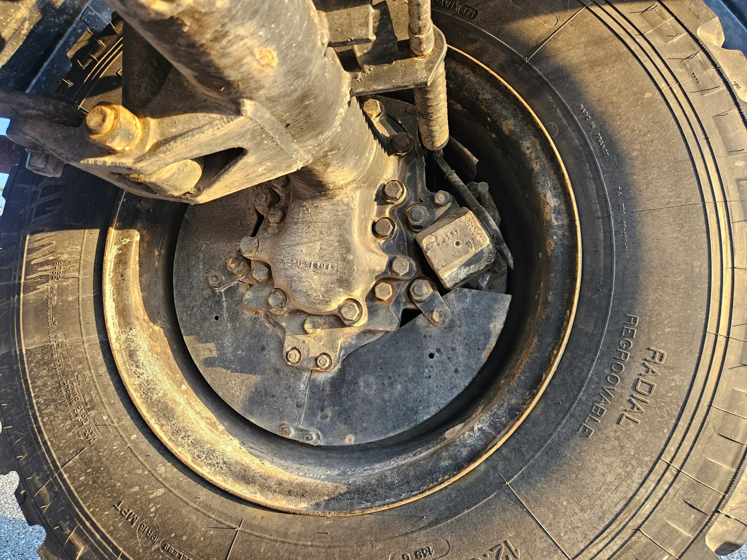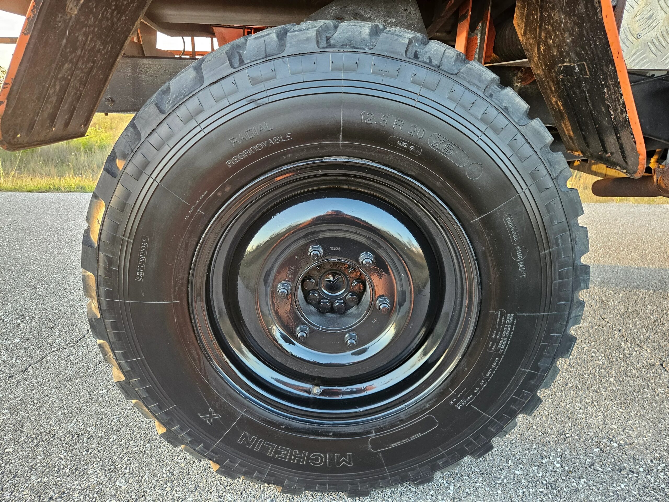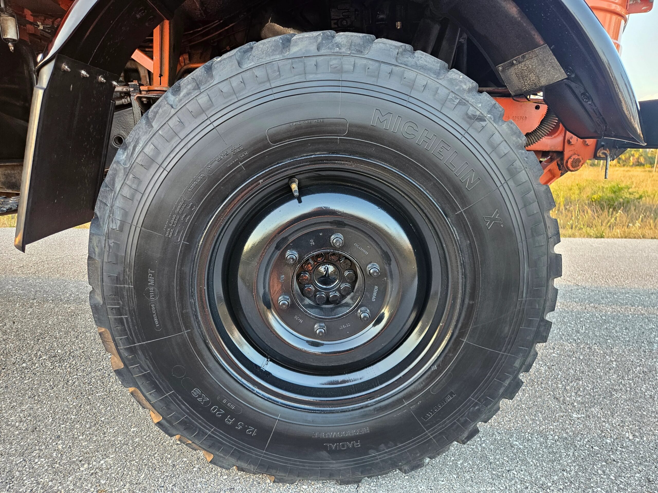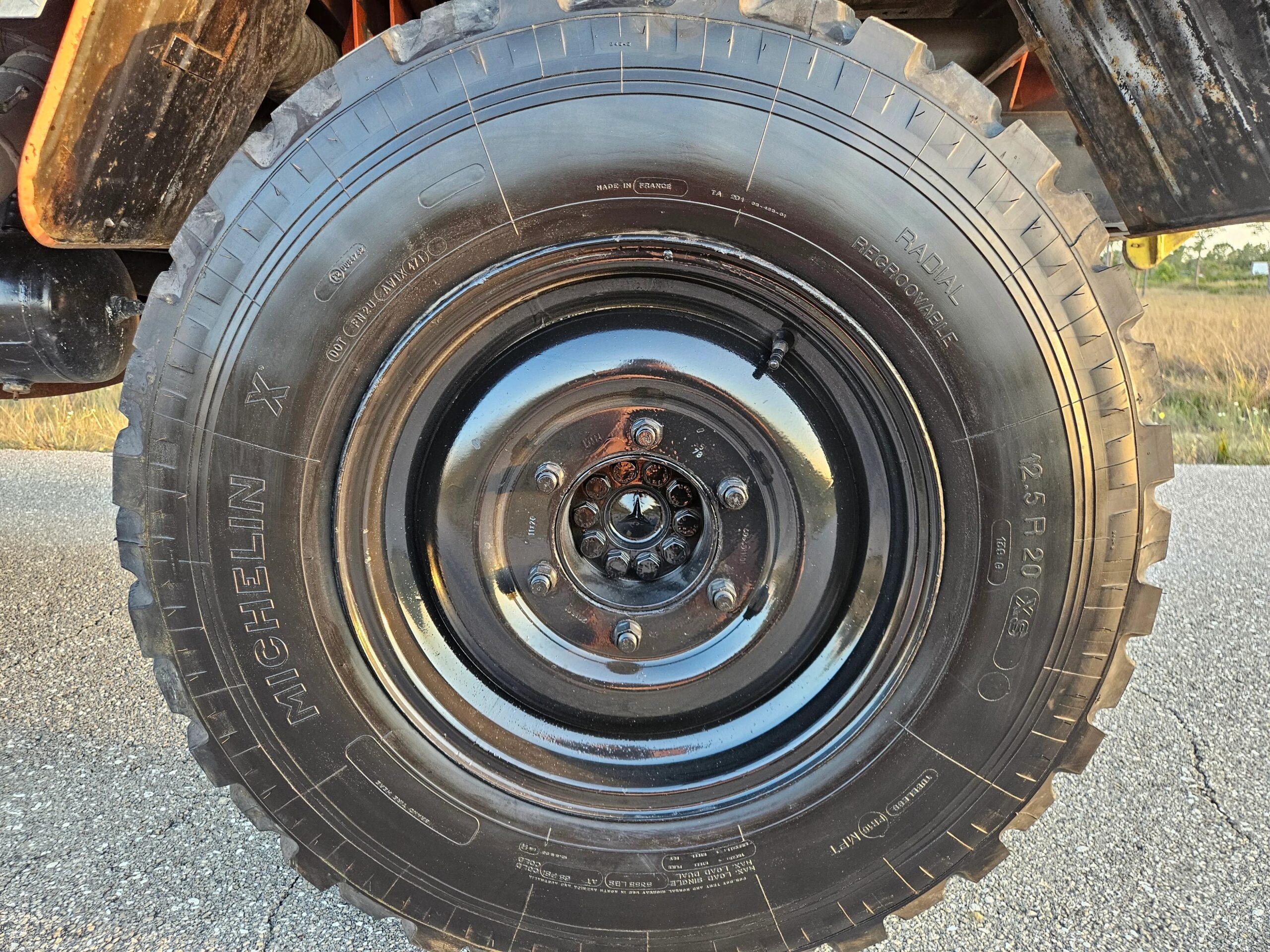 The 20” steel wheels were painted black by the selling dealer and are mounted with Michelin X tires. A matching spare is mounted at the front of the bed, and the truck is equipped with disc brakes at all four corners.