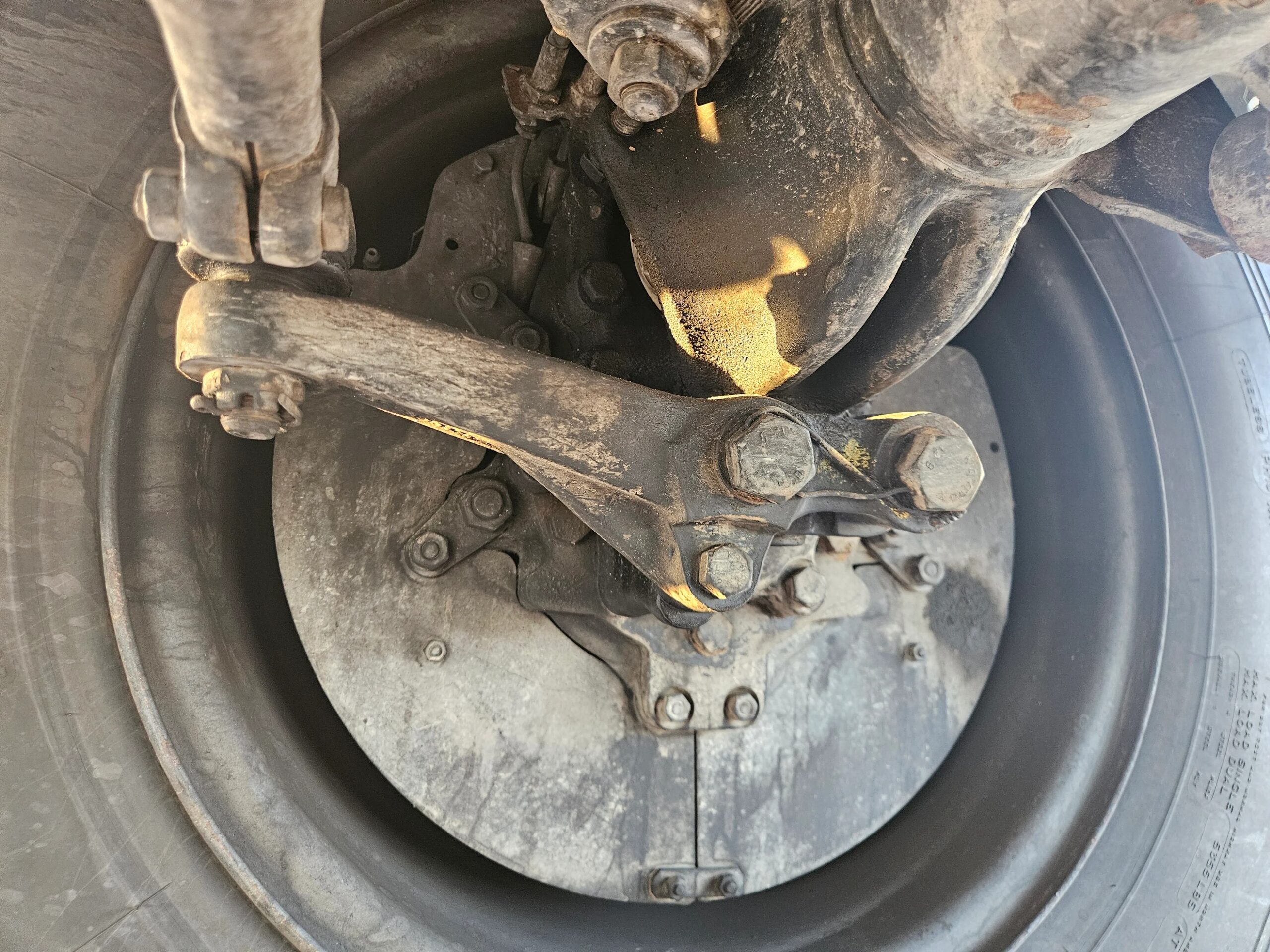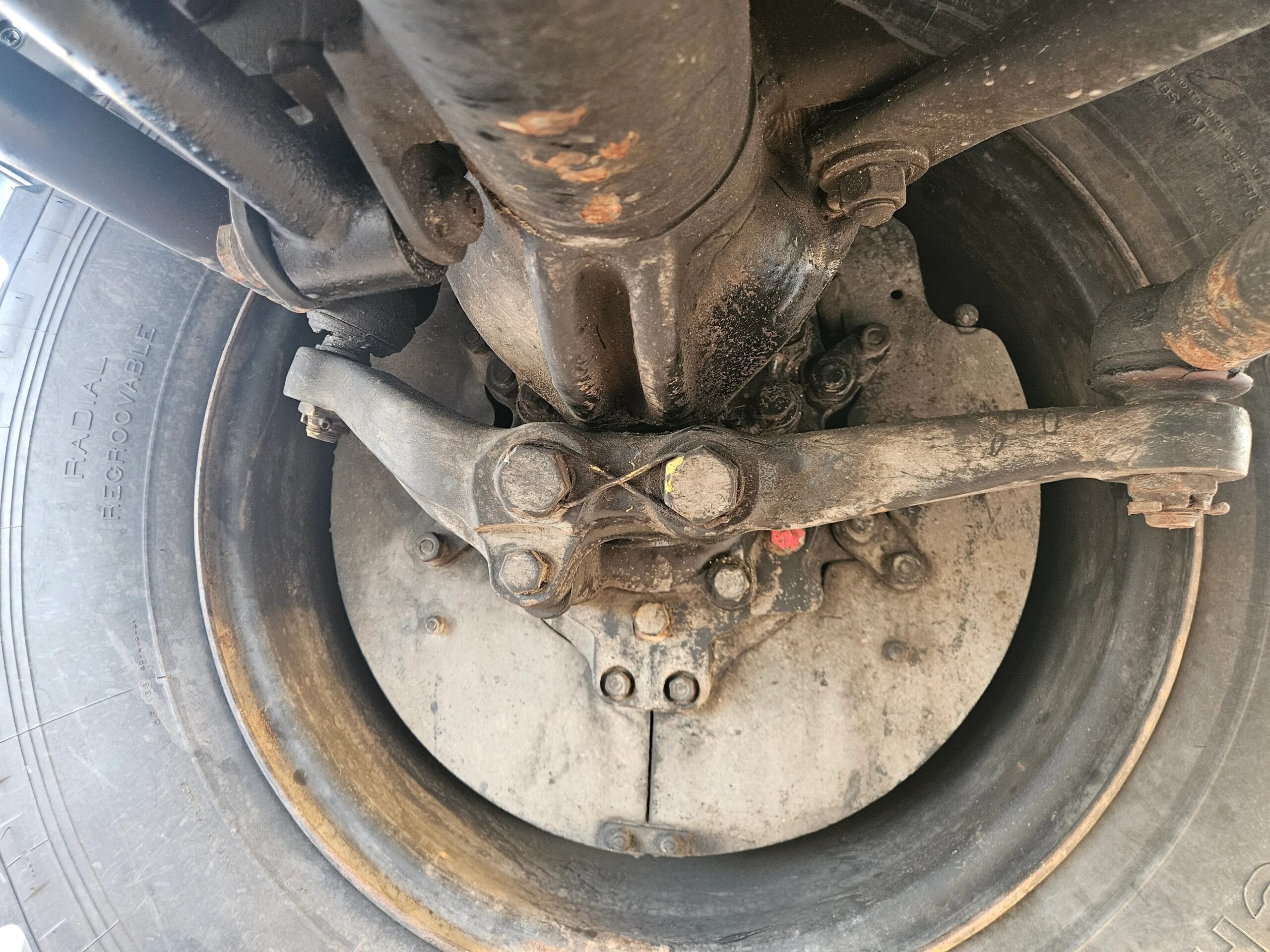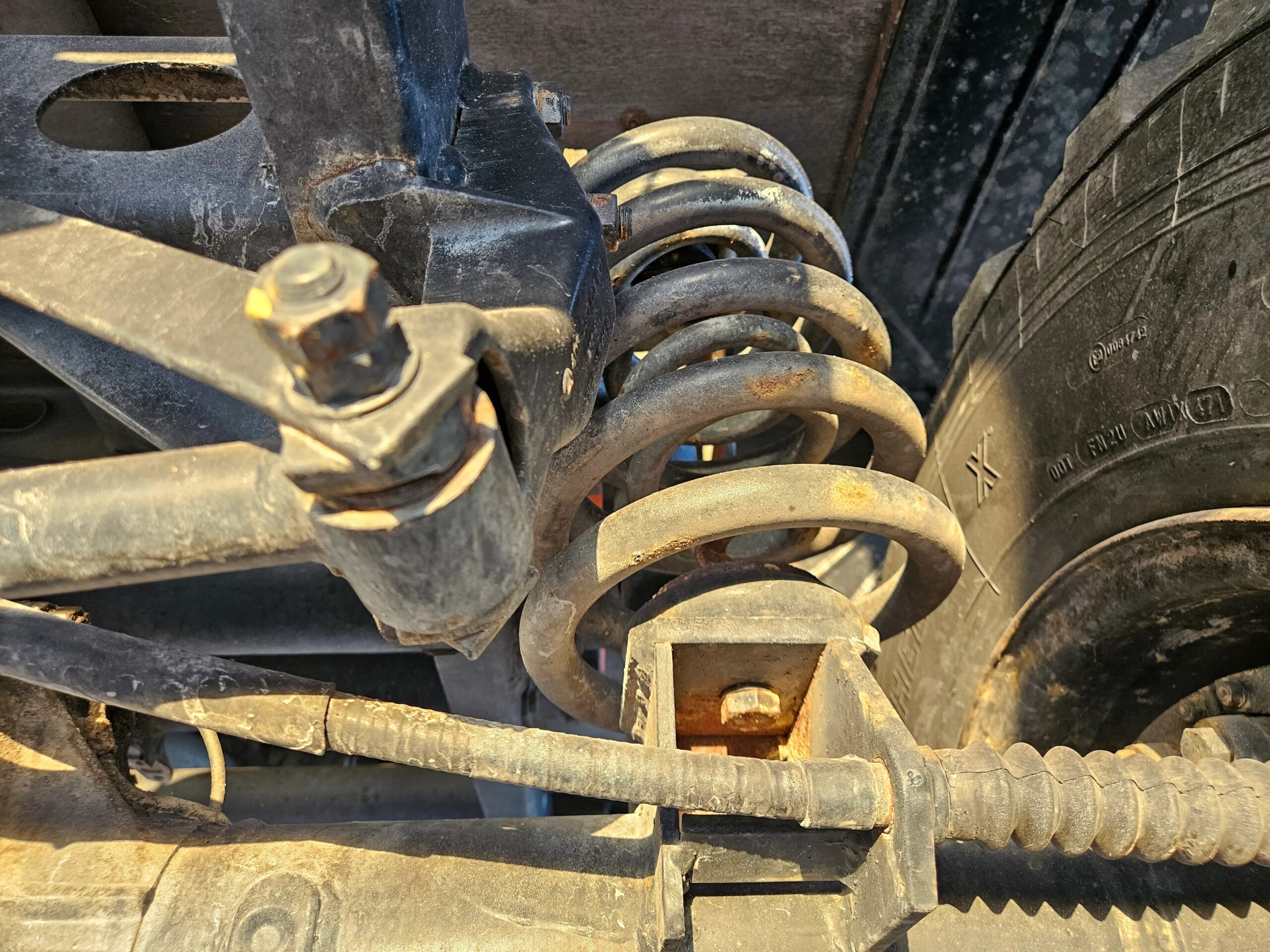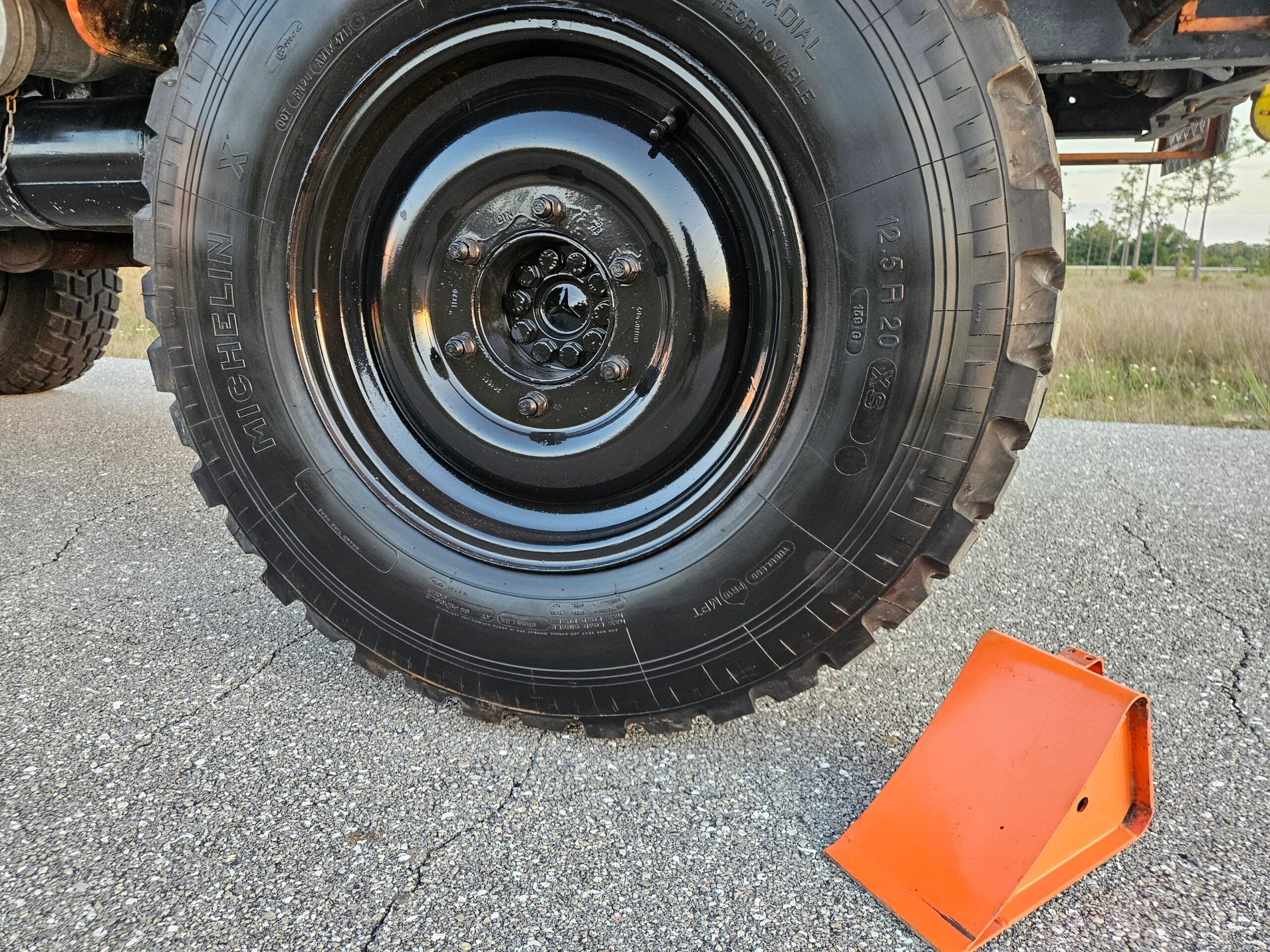 The 20” steel wheels were painted black by the selling dealer and are mounted with Michelin X tires. A matching spare is mounted at the front of the bed, and the truck is equipped with disc brakes at all four corners.