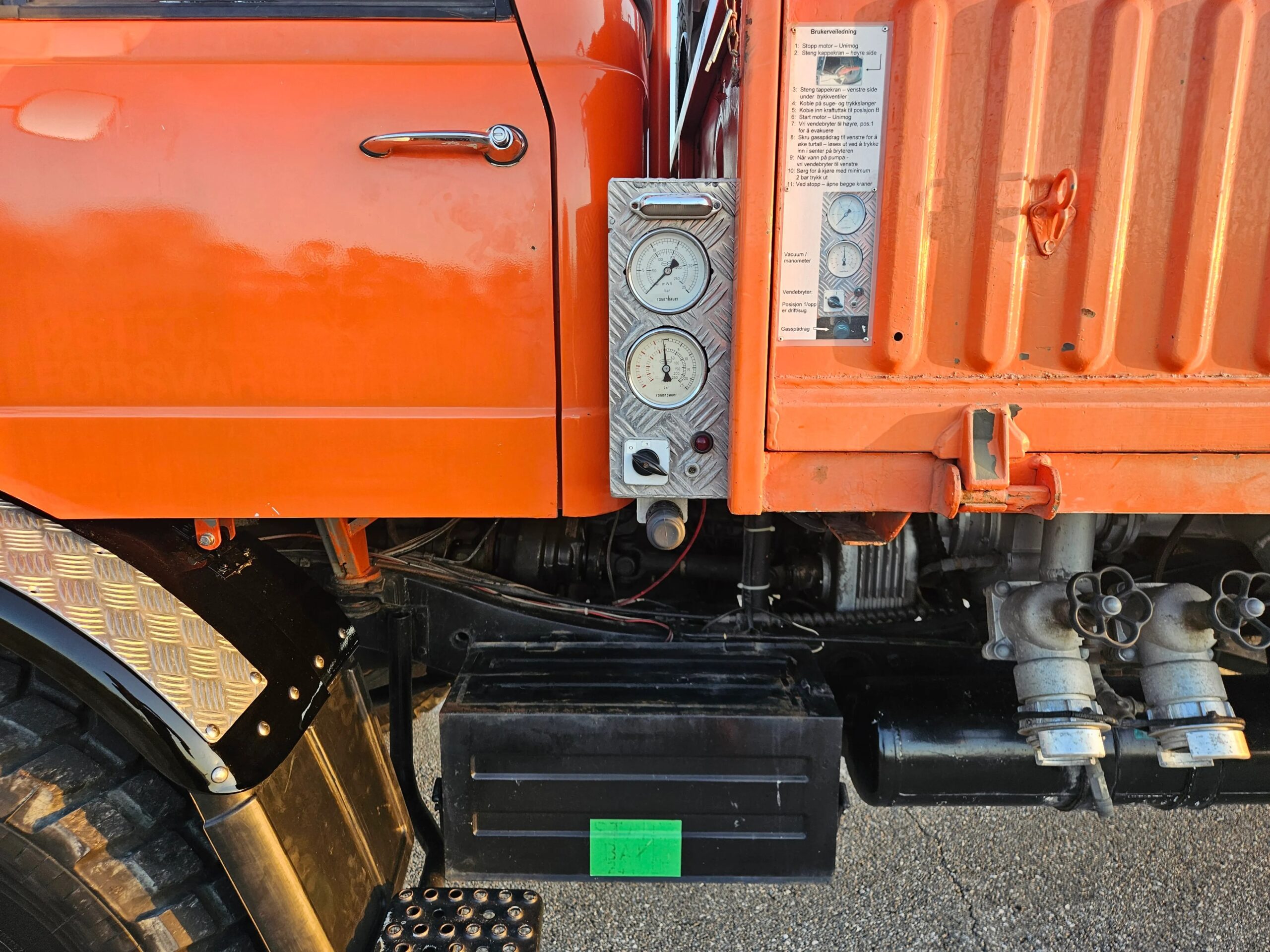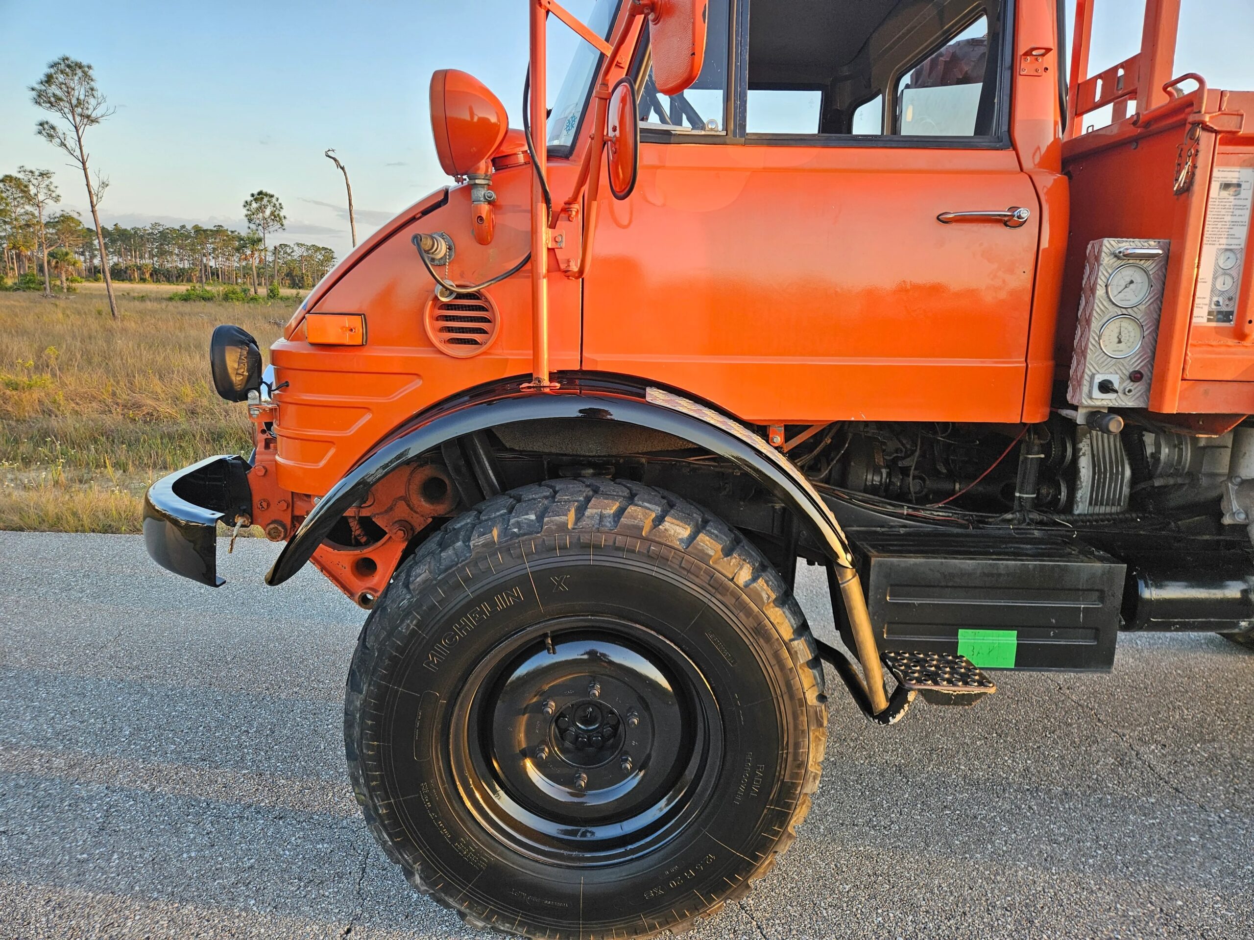 This 1979 Mercedes-Benz Unimog 416 was used as a firetruck by the Norwegian Civil Defense . It is finished in orange and is powered by a 5.7-liter diesel inline-six mated to a six-speed manual gearbox and a three-range transfer case. Equipment includes a water pump, front and rear telescopic work lights, a rear pintle hitch, emergency lights, portal axles, and 20” steel wheels with Michelin X tires in addition to a folding tailgate panel and bedsides. The cab houses a pair of individual seats wrapped in gray cloth upholstery and separated by an engine cover with an attached table top. This Unimog offered with two suction hoses, a 25m discharge hose, a build sheet, an owner’s manual, a 1979 Norwegian vehicle registration document
