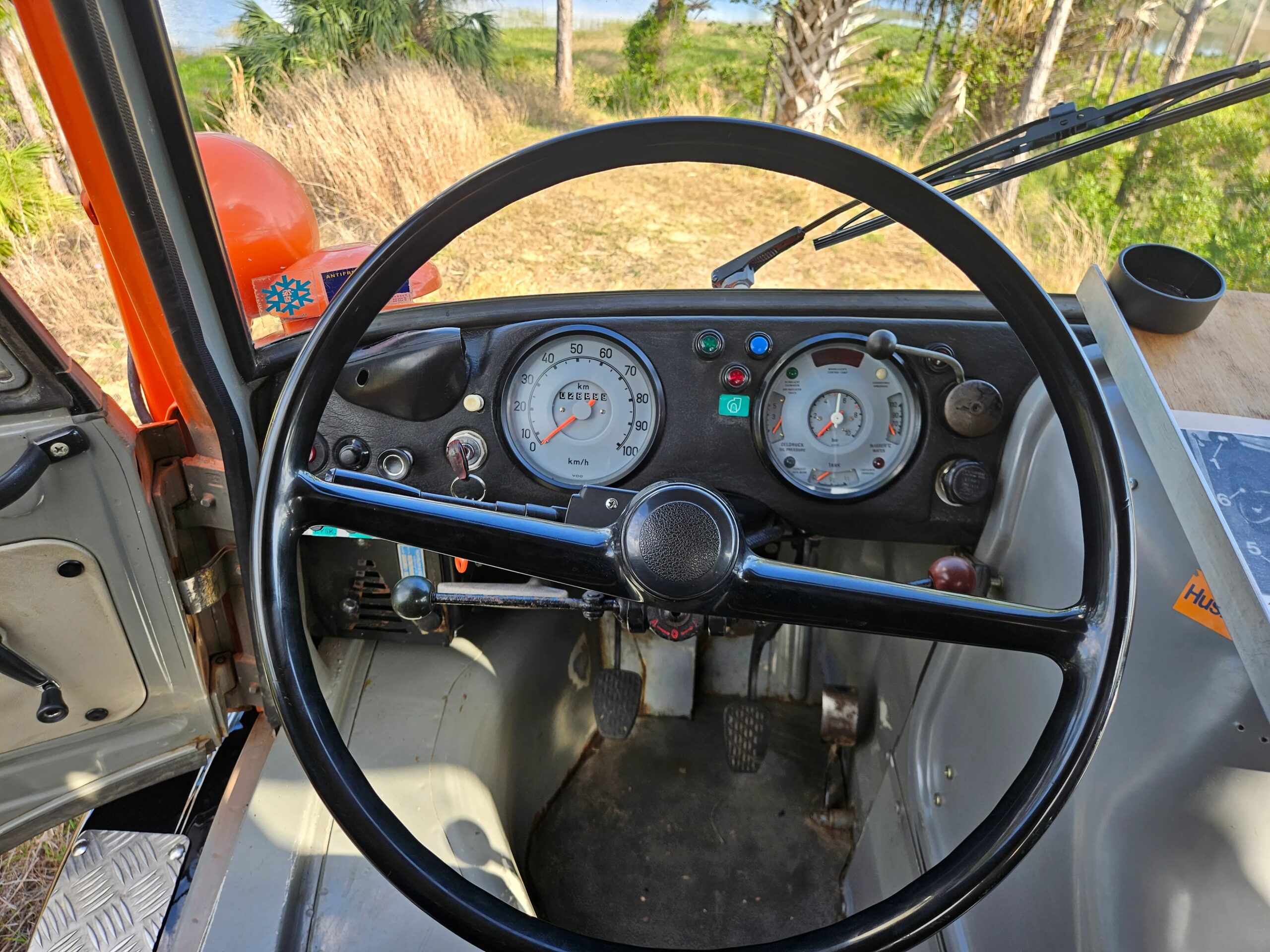 A two-spoke steering wheel sits ahead of VDO instrumentation that includes a 100-km/h speedometer and a combination gauge. The six-digit odometer shows approximately 29k kilometers (~18k miles)