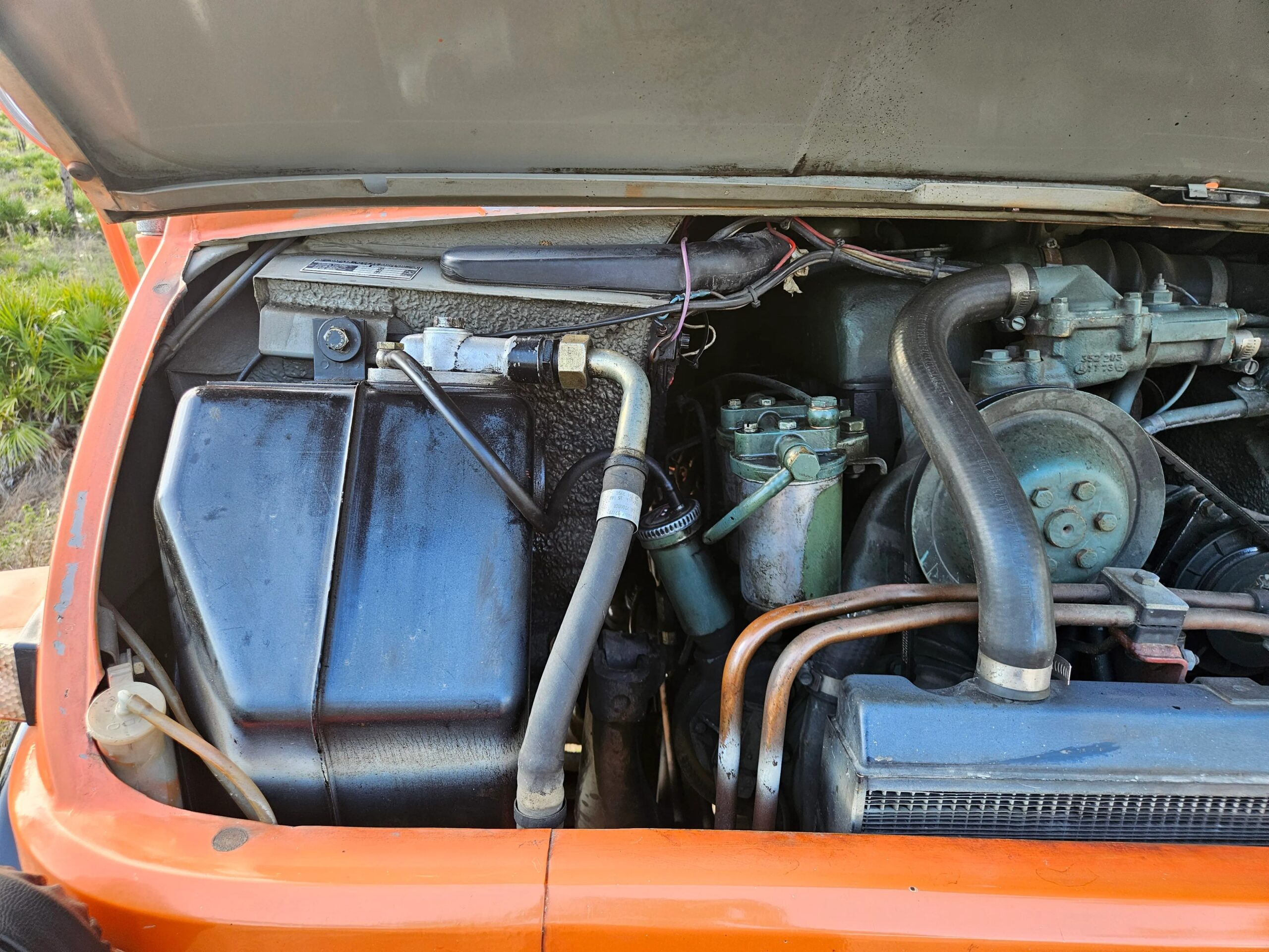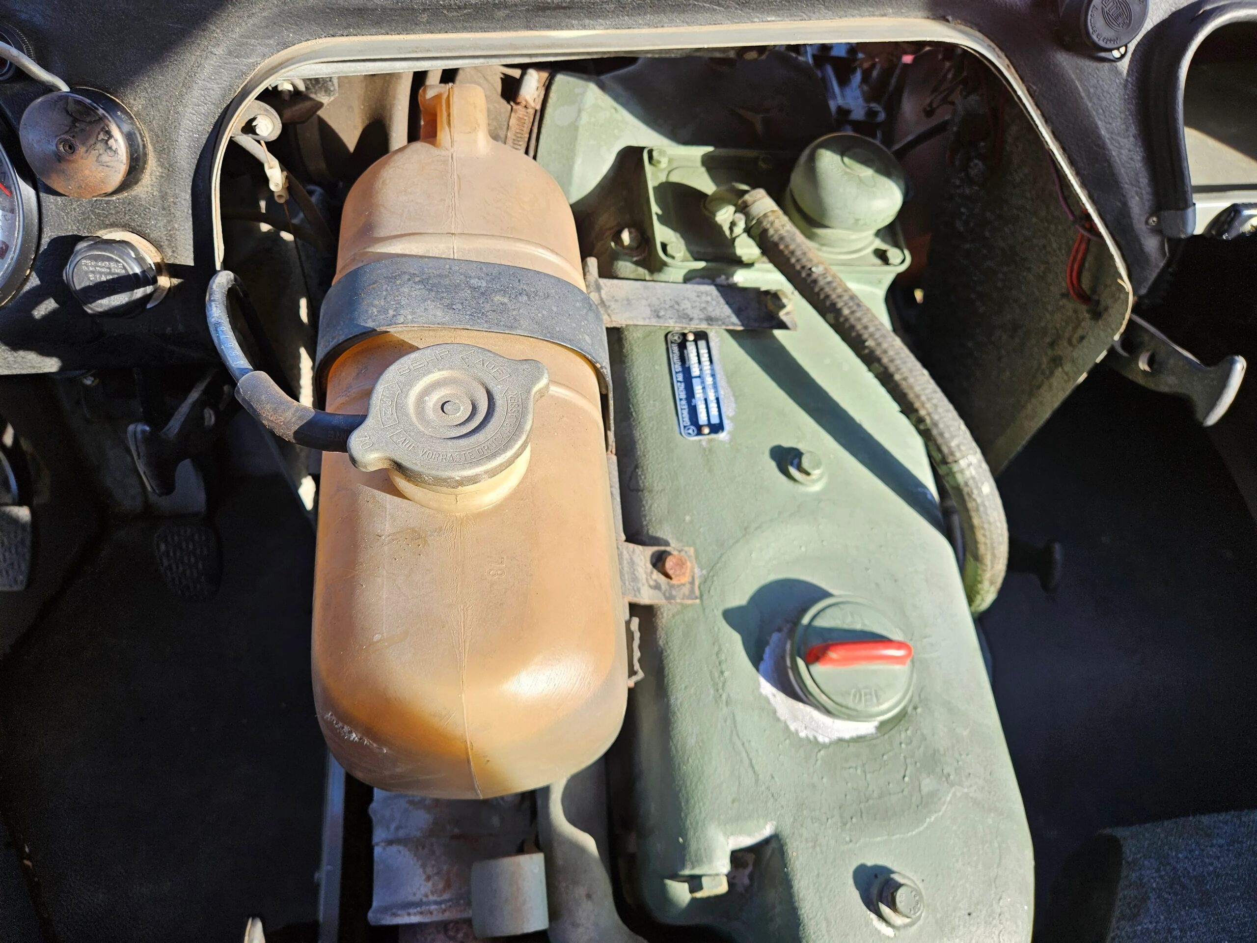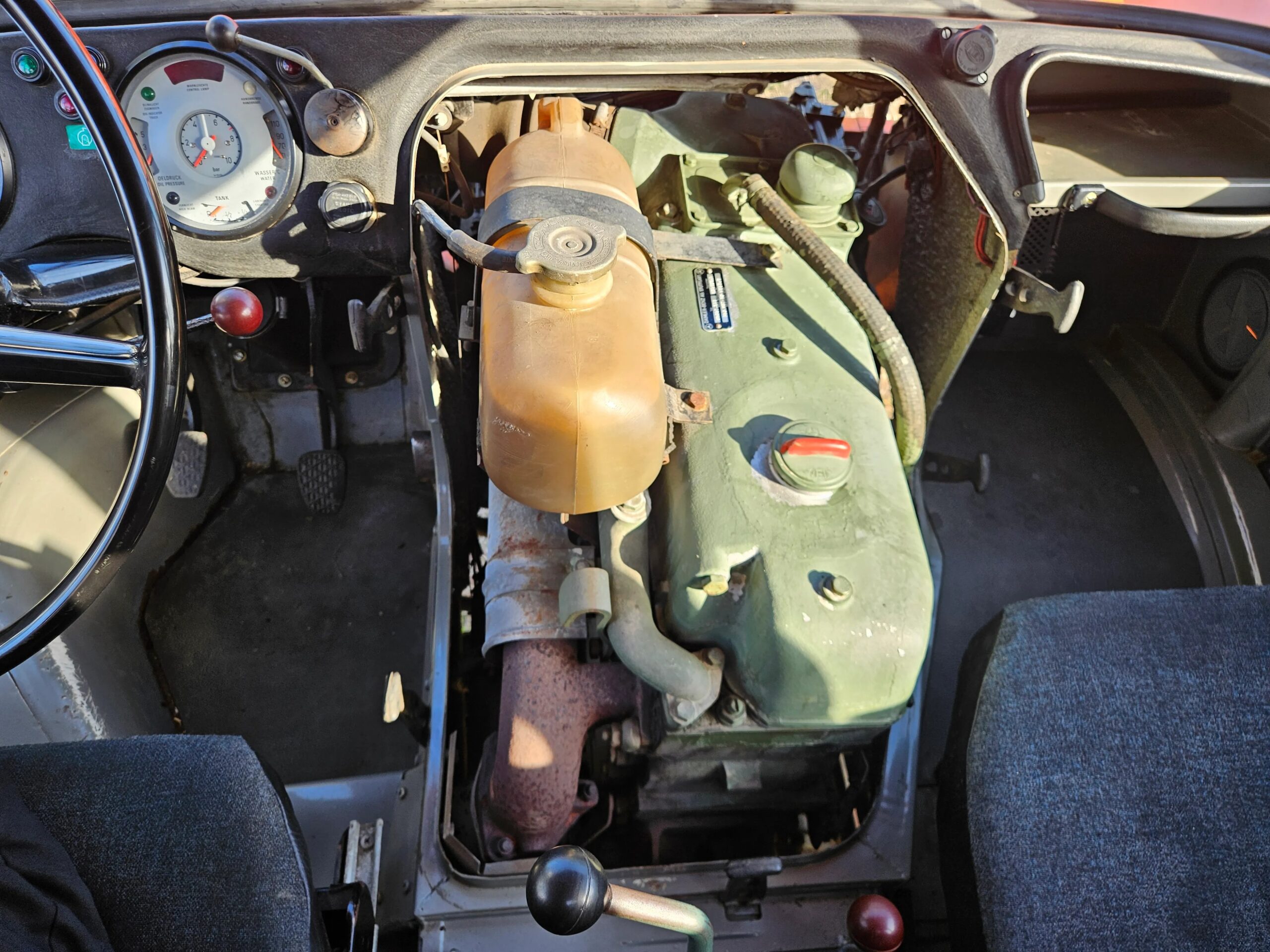 The 5.7-liter OM352 diesel four-stroke inline-six is accessed via the cabin or front hood, and it sends power to all four wheels via a manual gearbox with six forward gears, a three-range transfer case, and portal axles.