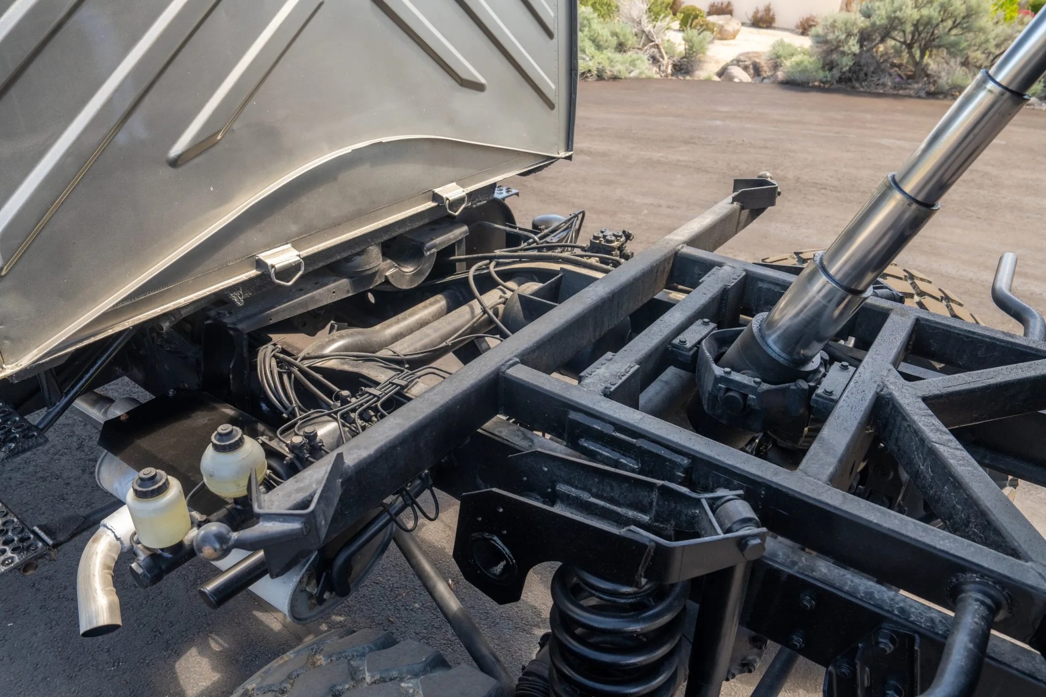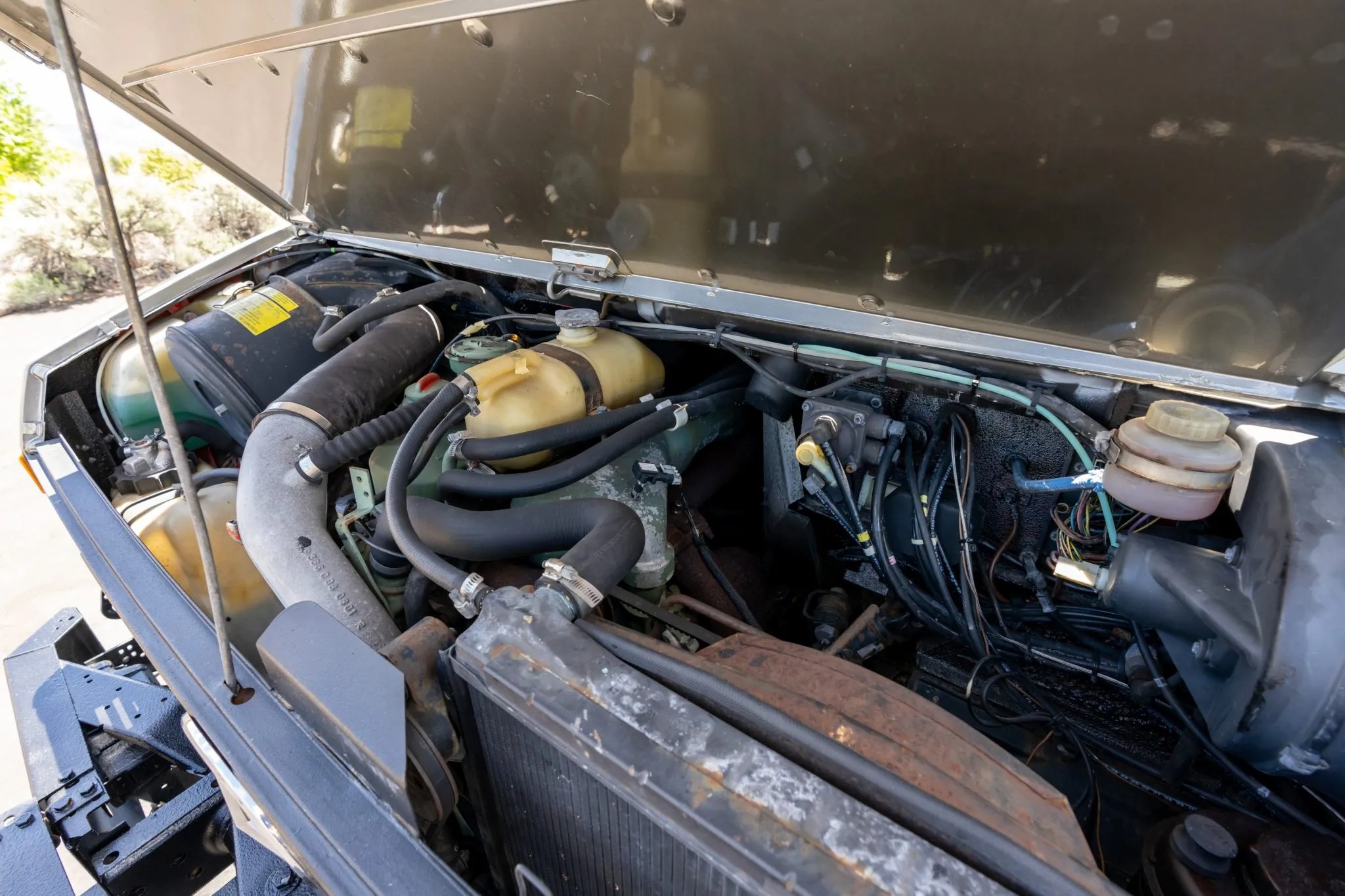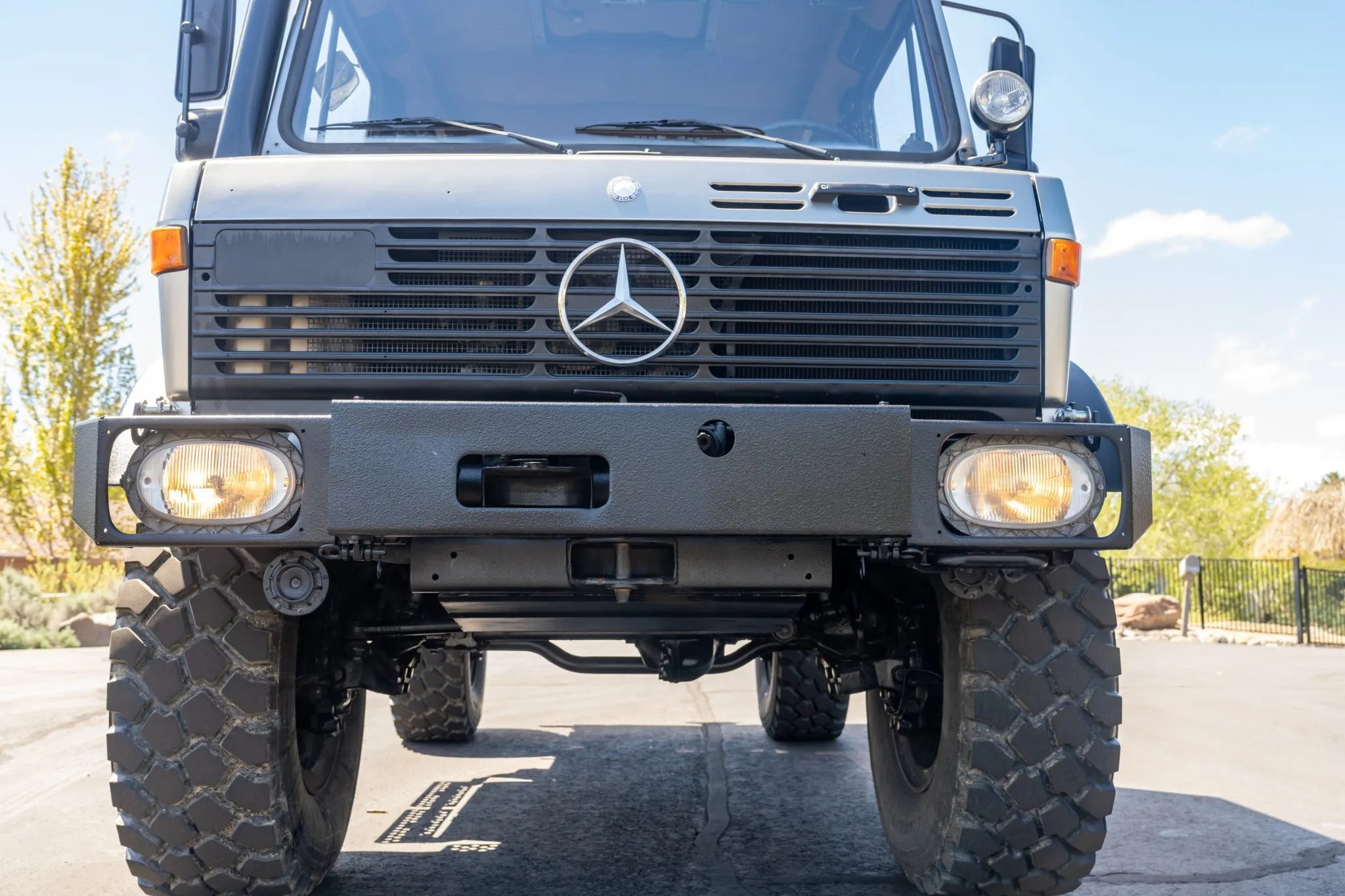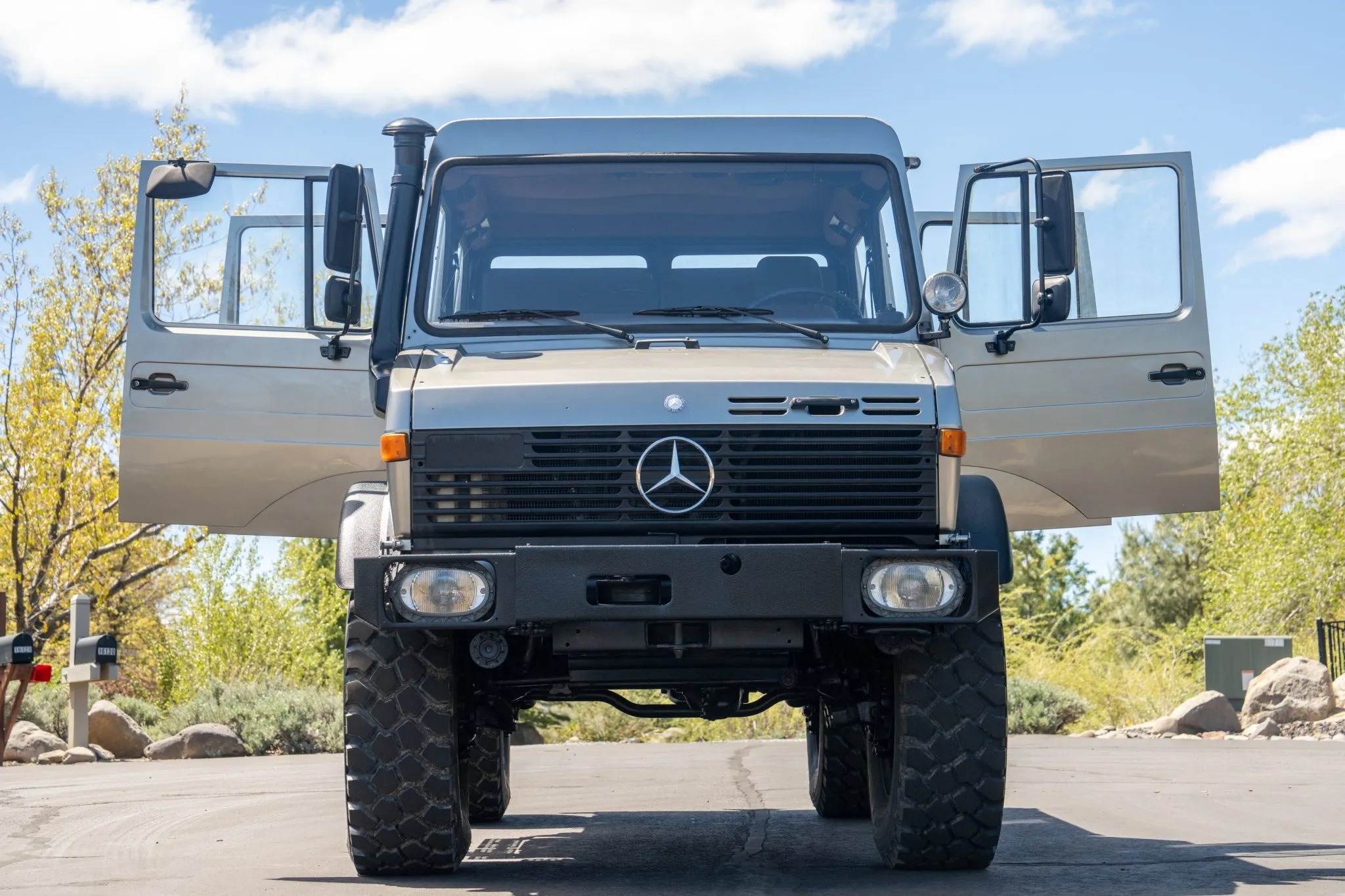 This 1991 Mercedes-Benz Unimog is a 427-series U1650L Doka model that shows 57k kilometers (~35k miles), and it is powered by a 6.0-liter OM366 turbodiesel inline-six paired with a 32-speed UG3/65 manual transmission. Subsequent work has involved repainting its high-roof cab, refreshing its six-passenger interior, replacing its wheels and tires, and overhauling its disc brakes and portal axles, which have “super-fast” gearing for highway operation. Additional equipment includes a hydraulic three-way dump bed, a front power take-off, and three locking differentials. This square-body Doka is offered with a data card, spare parts, service records and receipts from current ownership.